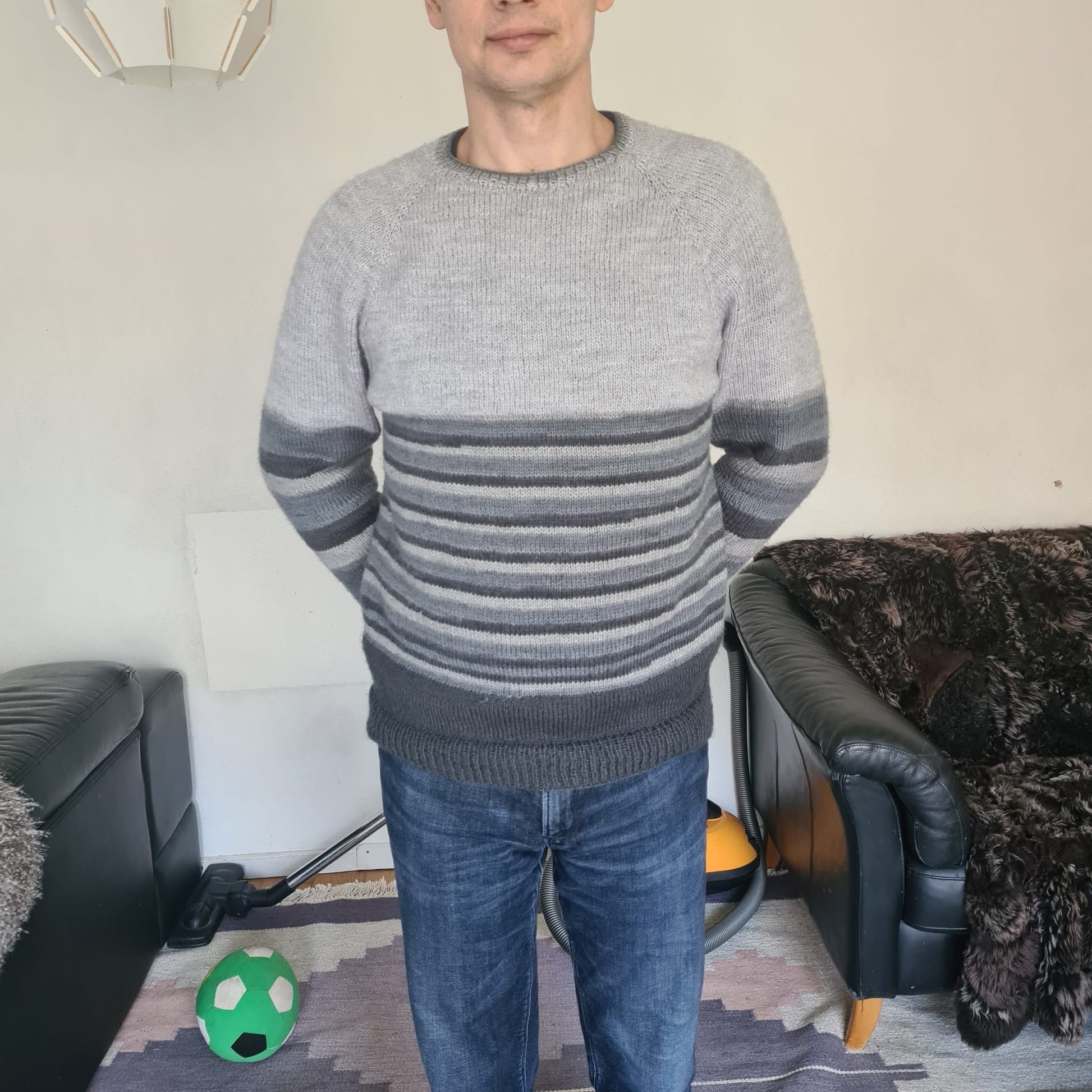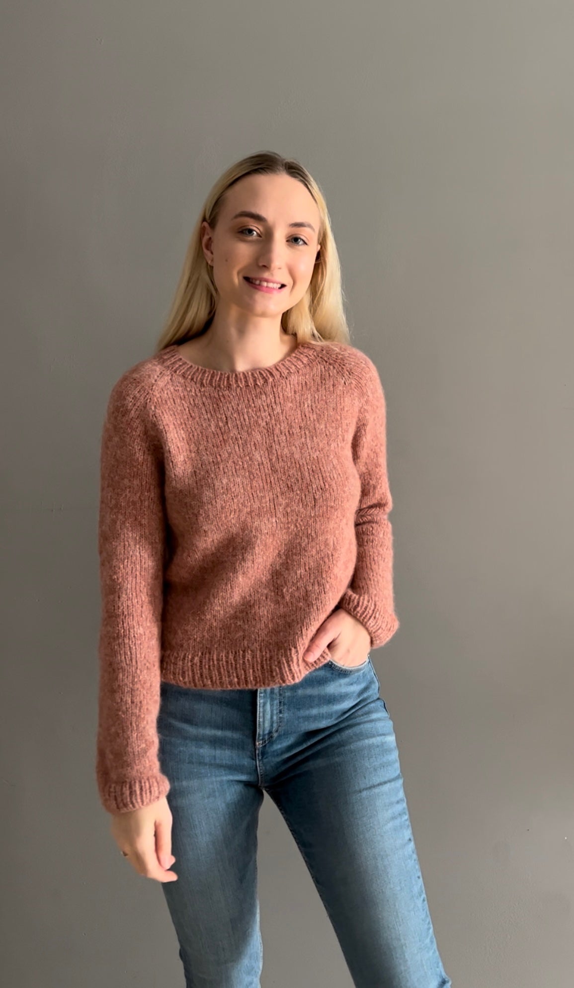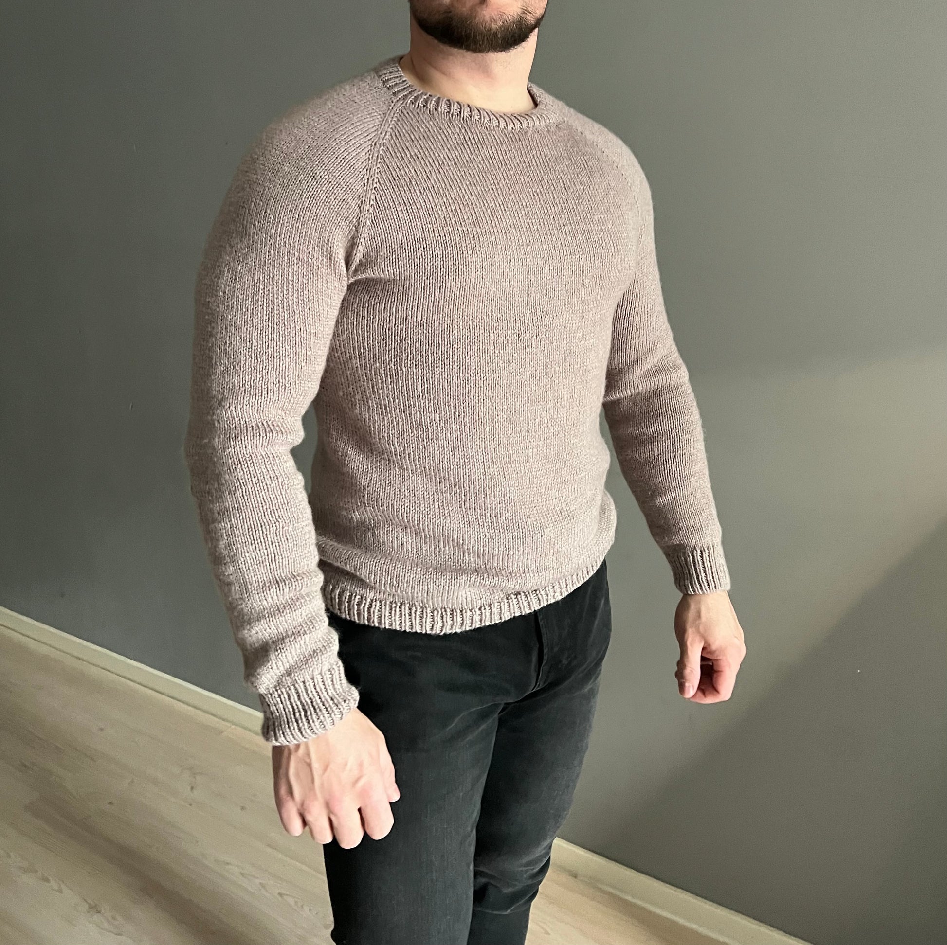 Džemperis tiek adīts apaļadījumā reglānā no augšas uz leju. Džemperim tiek izadīts “mēnestiņš” muguras daļā + priekšpuses noapaļojums ar neapbeigtajām rindām. Tas ir vajadzīgs, lai džempera priekšpuse būtu zemāk nekā mugurdaļa – lai džemperis labāk piegulētu augumam. Kad reglāna līnijai ir sasniegts noteikts garums, tad atdala stāva daļu no piedurknēm. Pēc atdalīšanas adīt pa apli stāva daļu. Pēc tam adīt abas piedurknes. Beigās no pagaidu uzmestajiem valdziņiem (kakla apdarei) uzceļam valdziņus un adīt valnīti 1x1.