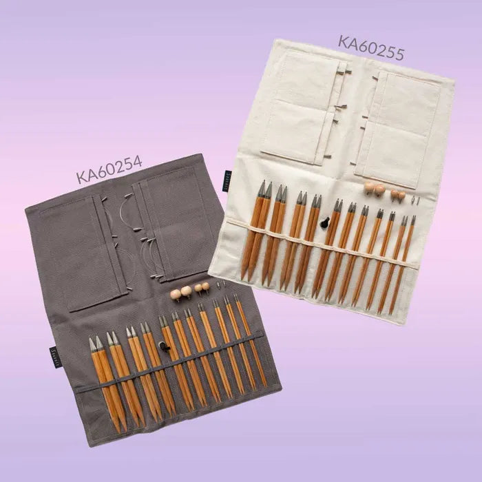 The CURVE Koshitsu interchangeable knitting needle Premier set is a complete set with interchangeable knitting needle tips, cables and accessories. The needle tips in this set have different needle sizes and are 15cm long. This makes this set the perfect tool for all sorts of knitting projects. The CURVE Koshitsu needle tips are made of bamboo. They undergo a high-pressure treatment at high temperatures, after which they are carefully polished with natural plant wax. This not only makes the knitting needles very durable, but also protects them against external influences. In addition, it prevents the needles from warping over time. It also makes the surface of the needles even and smooth. The lightweight knitting tips lie comfortably in the hand and the natural material feels pleasantly warm to the touch. Thanks to the seamless transition between the bamboo tips to the screw fitting, your yarn will never get caught. The swivel function allows the needle tips to rotate freely and prevents the cables from kinking or twisting. With the included cable joints and stoppers you can create longer cables or flexible single-pointed knitting needles. The items in this set have different screw sizes. The needle size of the desired interchangeable needle tip determines which screw size for cables, cable stoppers and joints you should use: M1.8 for needle sizes 2.00-3.25mm and M2 for sizes 3.50-10.00mm.